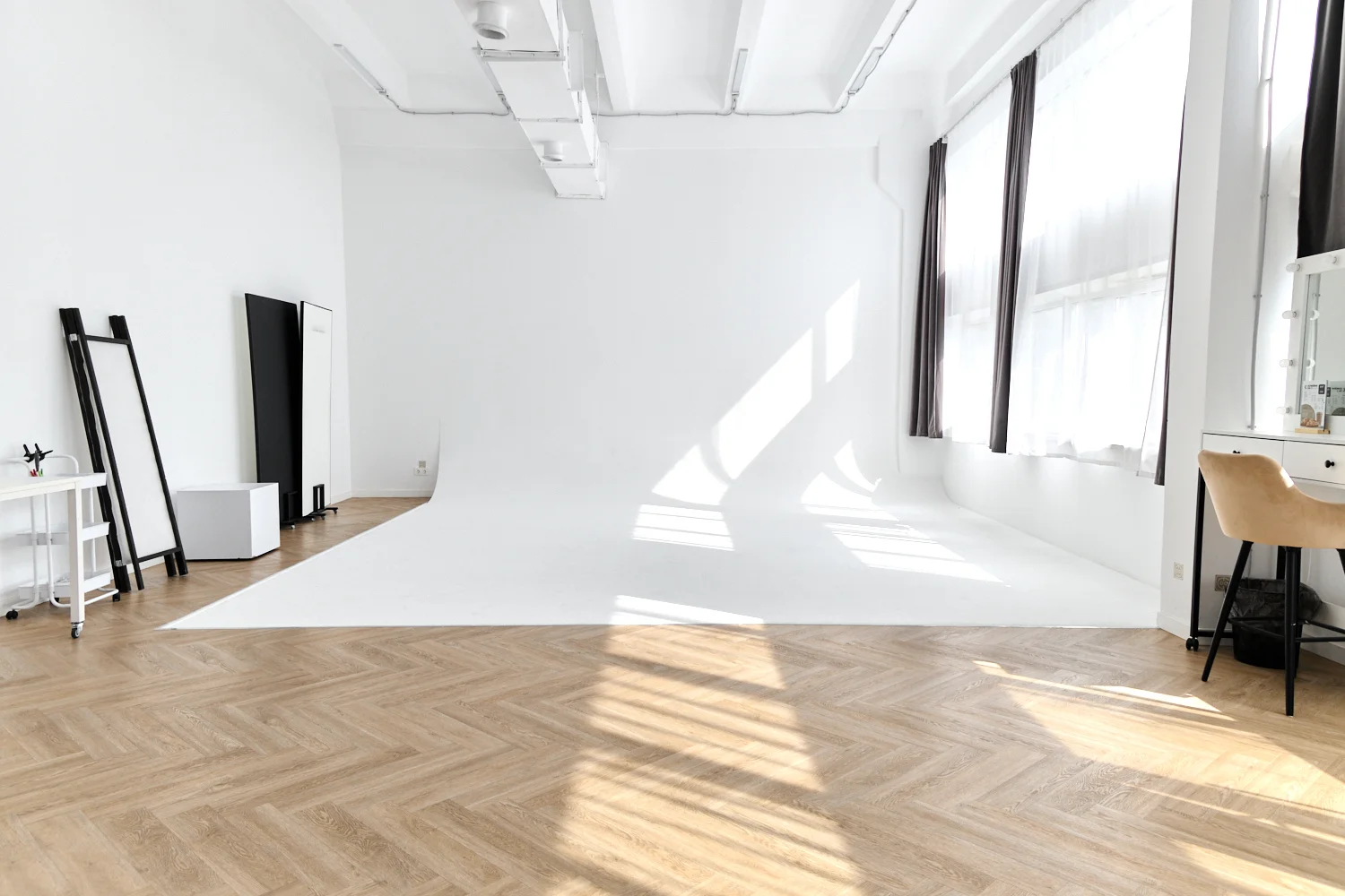 85 метров, 2 окна, циклорама, белый угол, интерьерная зона, солнечная сторона в 1 половине дня, гримерное место, шторы блэкаут,