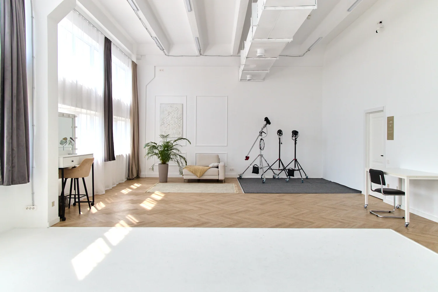 60 метров, 2 окна, интерьерный зал, гримерное место, солнечная сторона в 1 половине дня, шторы блэкаут.